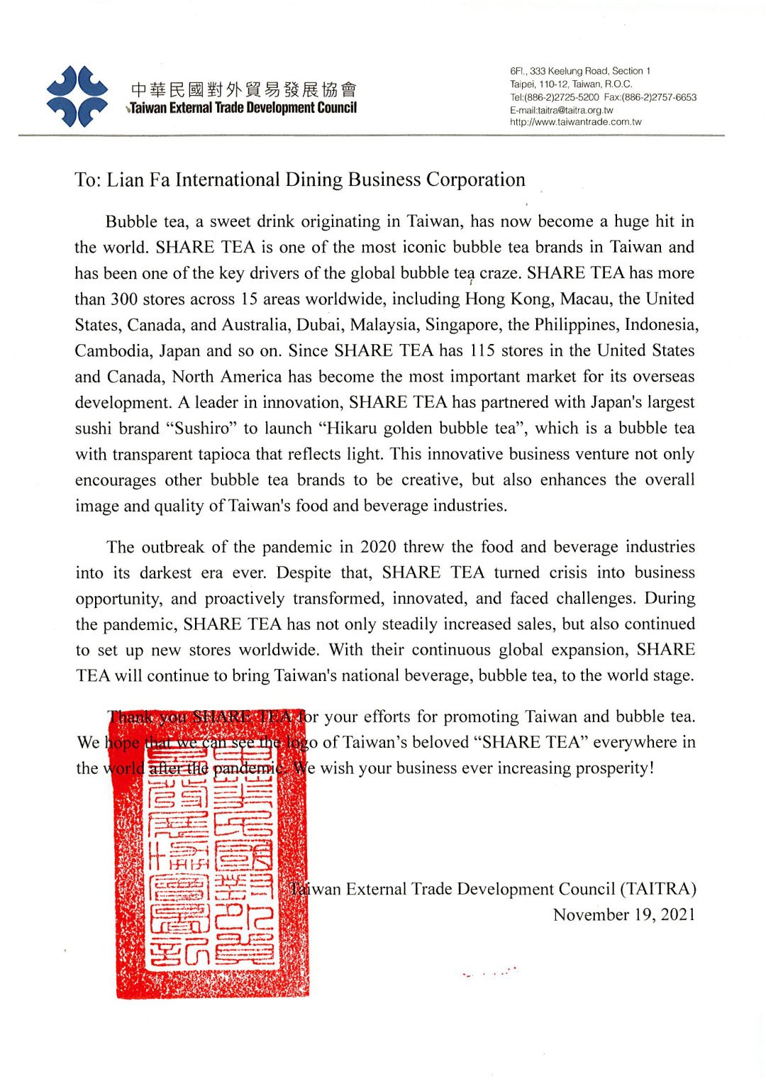 Sharetea is very honored to receive recognition from the Taiwan External Trade Development Council. We will continue to introduce Taiwan’s bubble tea culture to many more people and expand our business globally!